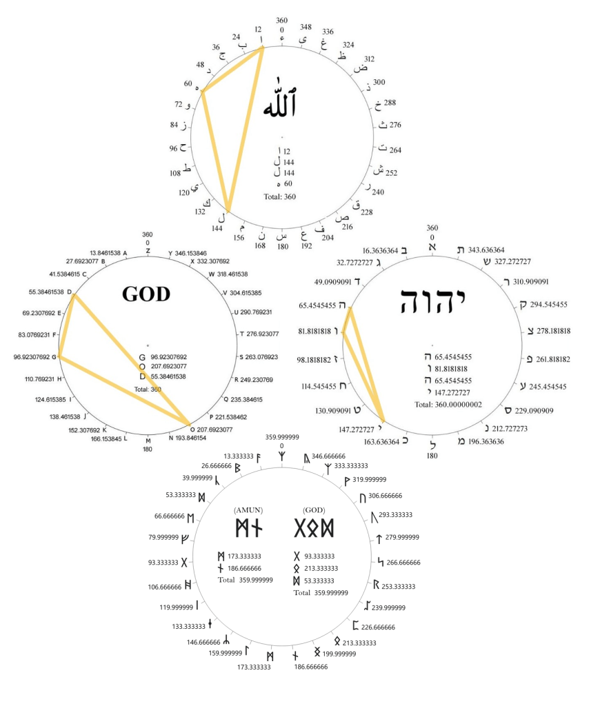 Summing the degree value of each letter of a language’s word for their deity being close or exactly 360 degrees.